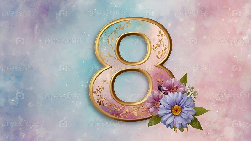 Международный женский день. праздник приходится на 8 марта. баннер, флаер. праздничный цветочный фон с номером 8