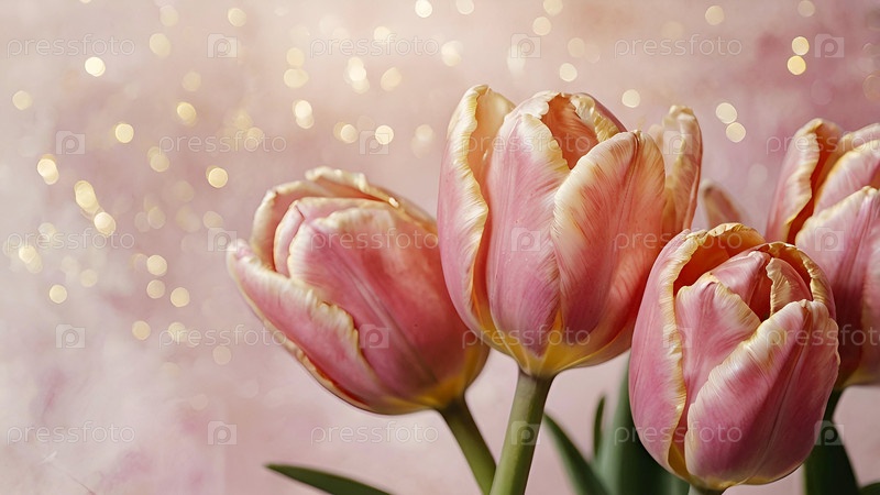 Тюльпаны - это весенние цветы. Красивый цветочный фон с красивым эффектом боке. Пузырьки тюльпана на розовом акварельном фоне со золотыми венами
