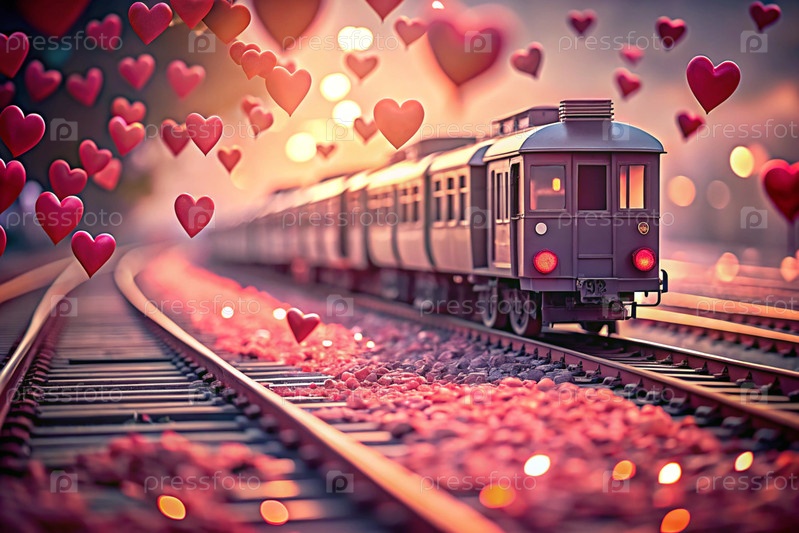 Путешествие любви. поезд и сердца вокруг. подарок для любимого человека в День святого Валентина - это как романтическое путешествие. баннер с предложениями и акциями от туроператора