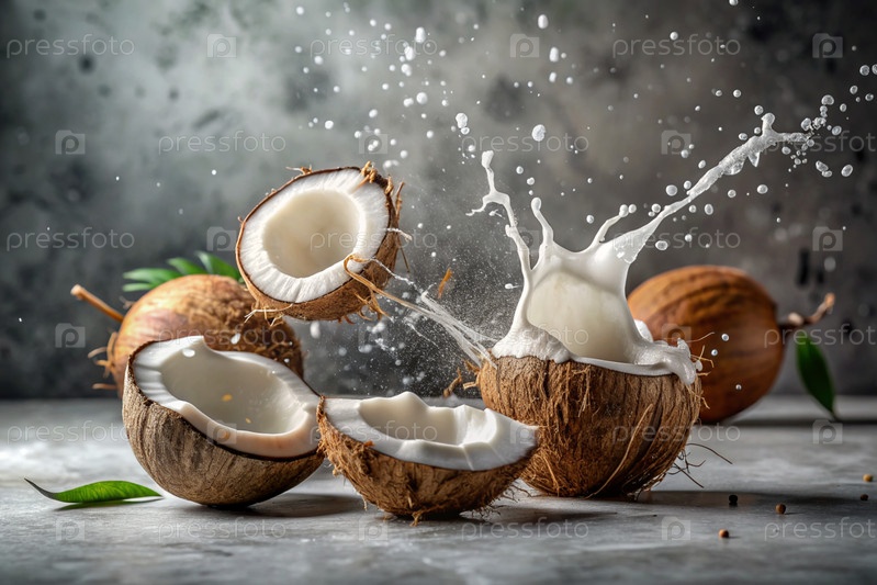 брызги кокосового молока и пальмовых листьев. Брызги молока - кокосы на сером фоне. Баннер для сладостей, курортной косметики или кремов по уходу за телом и лицом
