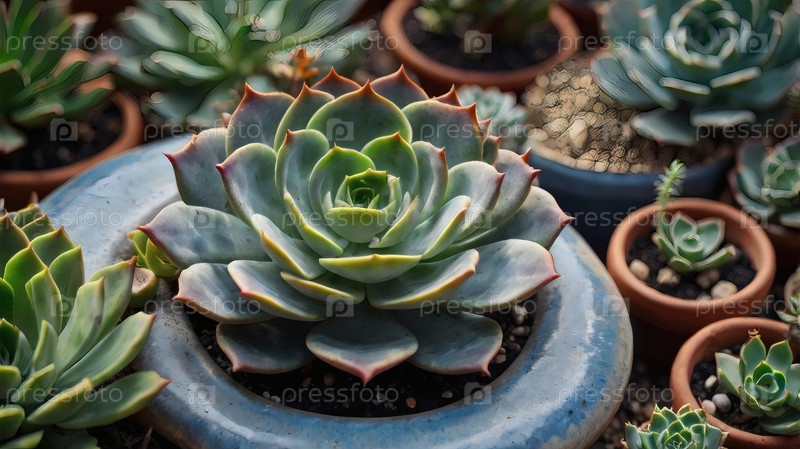 Группа миниатюрных сочных цветов в керамическом горшке в форме дома на подоконнике. Закрывая зеленые вершины растения эчеверия. Цветущие комнатные растения. Суккуленты