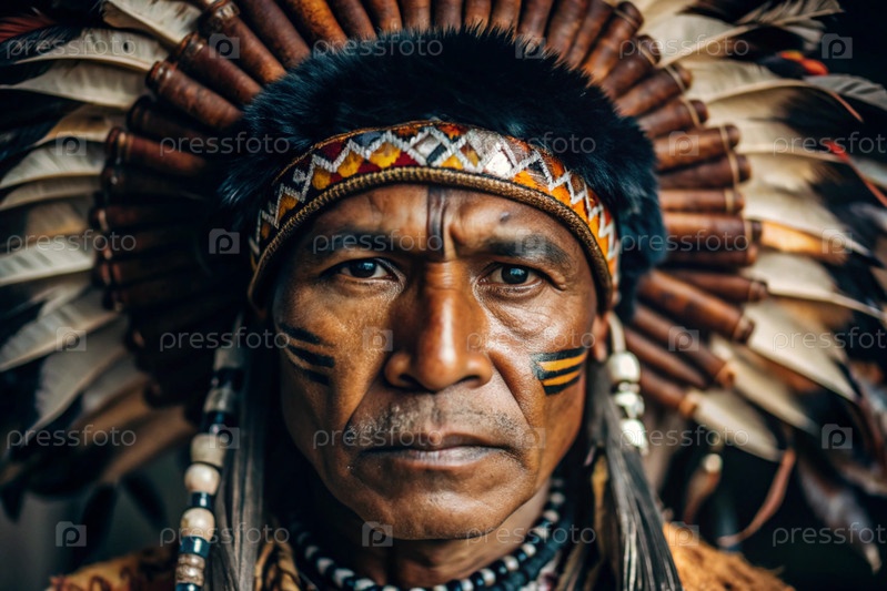 Красивый мужской портрет индейца, вождя племени в пернатом головном уборе