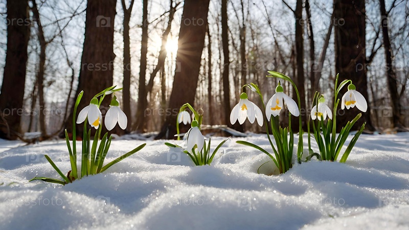 Первые весенние цветы.Белые снегопады в лесу крупный план на утреннем солнце.Весна
