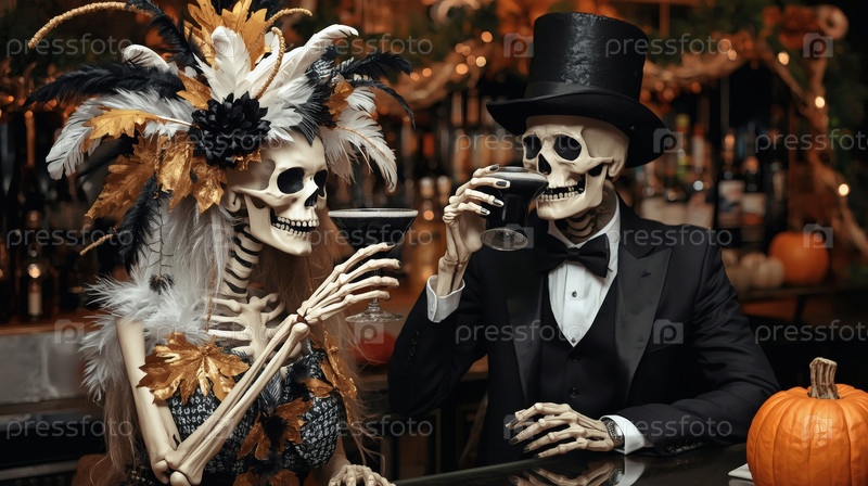 Пара любителей скелетов с коктейлями в баре.Хэллоуин или День мертвых