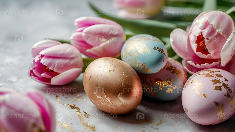 Нежные пасхальные яйца в розовых, золотых и фиолетовых тонах и цветы тюльпанов на пастельном акварельном фоне с деликатными венами
