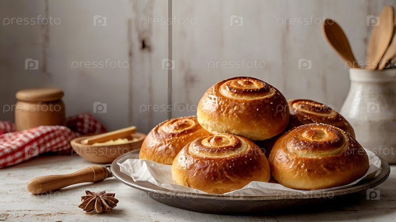 Свежие домашние выпечки на кухонном столе. свежие вкусные булочки в пекарне. свежевыпеченные мучные выпечки