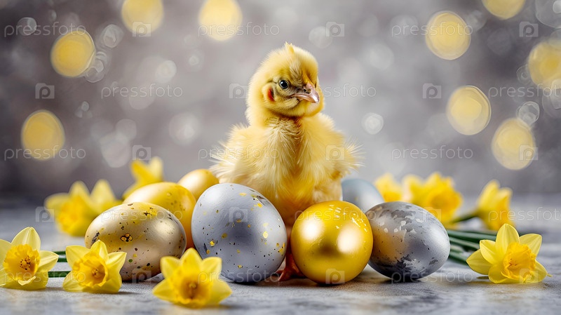 Нежные пасхальные яйца, желтые куры, цветы цыплят и нарцисс на фоне пастельного акварели с нежными венами