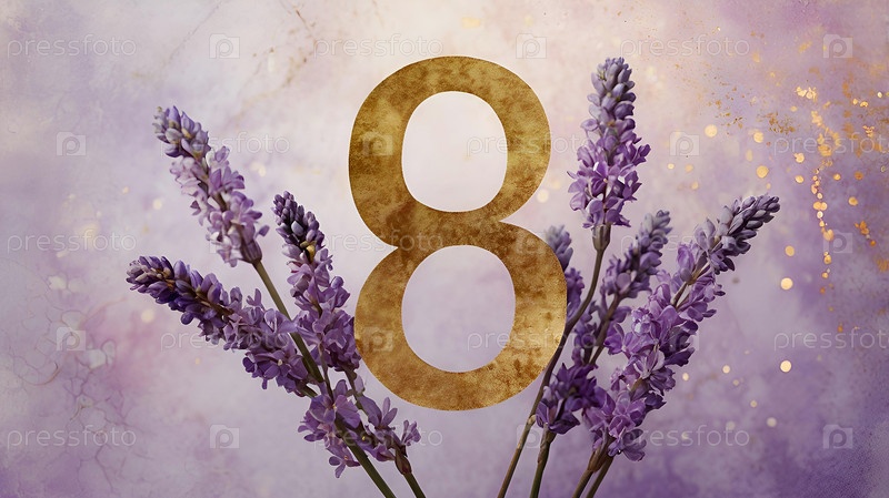 Международный женский день. праздник приходится на 8 марта. баннер, флаер. торжественный, нежный фиолетовый цветочный фон номер 8