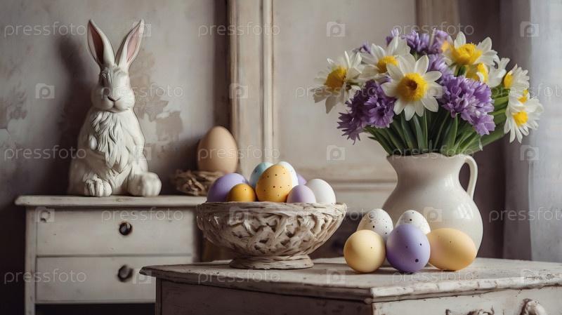 Концепция яркого пасхального праздника. Ретро интерьер дома с пасхальным декором. Весенние цветы в белой вазе и пасхальные яйца в пастельных оттенках