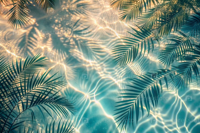 Концепция летнего отдыха на пляже. Вид тропических листьев на поверхности воды. Тень пальмовых листьев на белом песчаном пляже. Красивый абстрактный фон для баннера