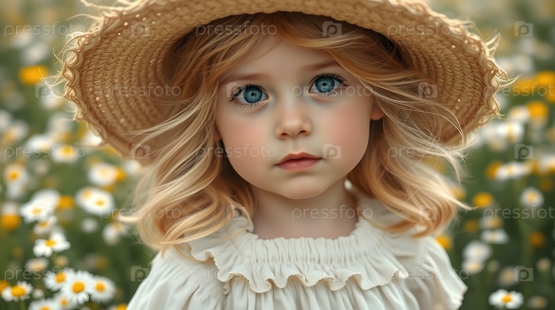 Всероссийский день семьи, любви и верности Красивая маленькая кудрявая девочка в соломенной шляпе на фоне поля ромашки День святого Валентина Петра и Февронии