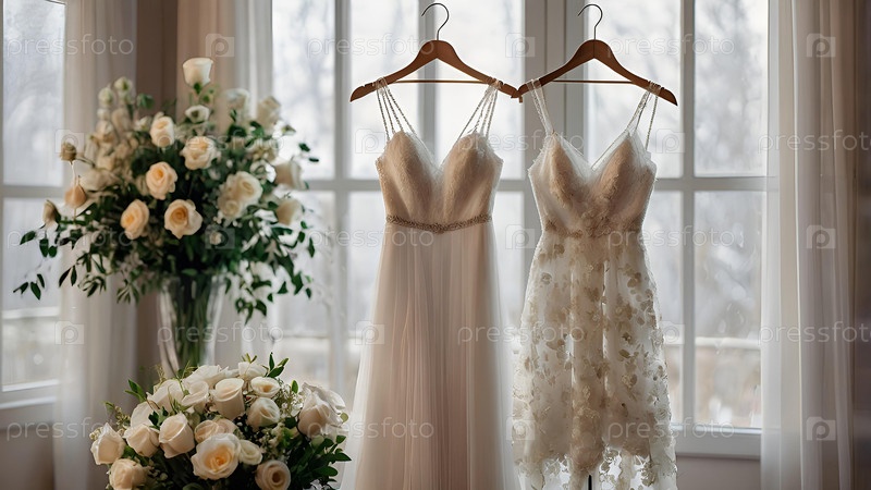 Близко. Элегантное белое свадебное платье на вешалке и букет цветов. Утро невесты. Аренда и покупка свадебных платьев для мероприятий