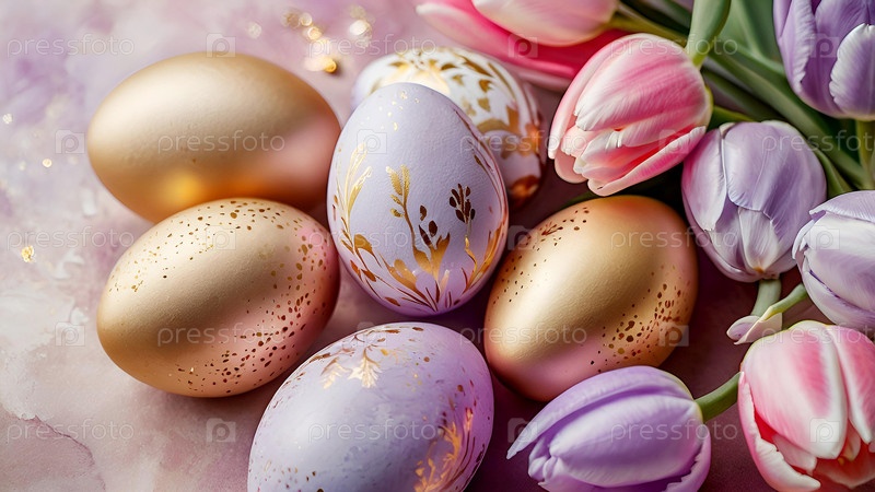Нежные пасхальные яйца в розовых, золотых и фиолетовых тонах и цветы тюльпанов на пастельном акварельном фоне с деликатными венами