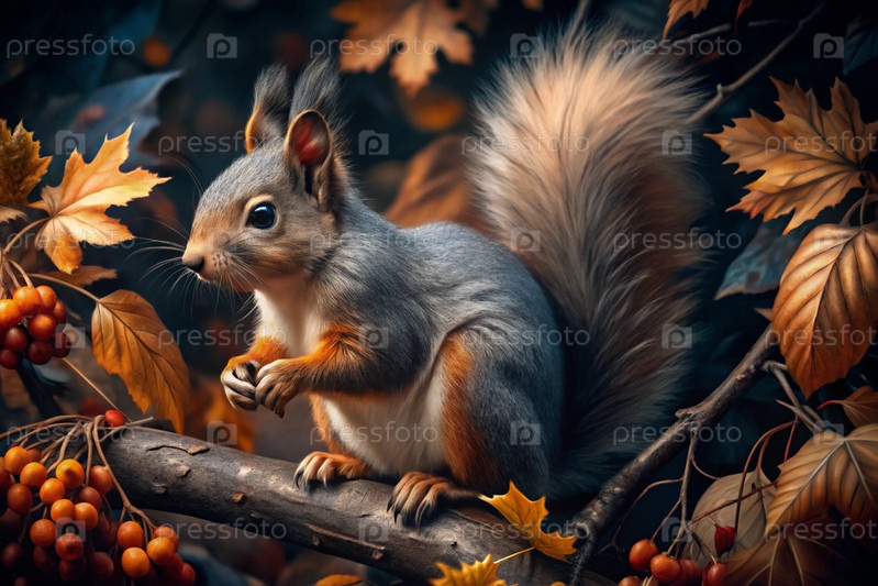 Портрет красивой красной пушистой белки на ветке осеннего дерева с красными ягодами