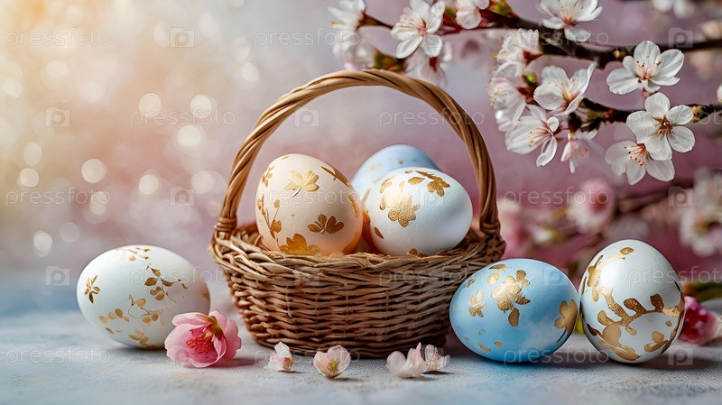 Нежные пасхальные яйца и вишневые ветви цветут на пастельном акварельном фоне с нежными полосками