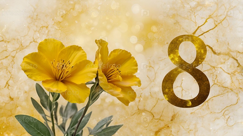 Международный женский день. Праздник приходится на 8 марта. Баннер, флаер. Праздничный желтый цветочный фон с номером 8