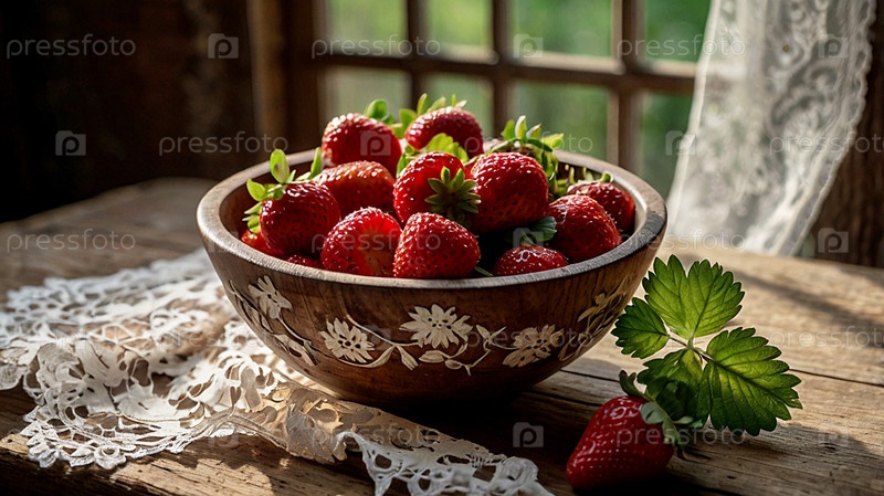 Фрукты и ягоды.Лето.Вкусные свежие клубники на деревянном столе в деревенском доме ретро-стиля.Место для текста