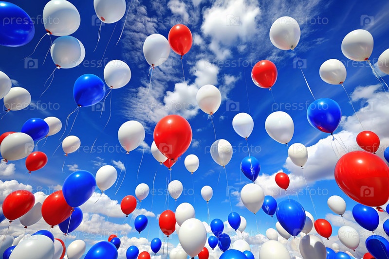 Концепция празднования Дня России 12 июня.Балоны в цветах триколора России.Белый, синий, красный летают по голубому небу