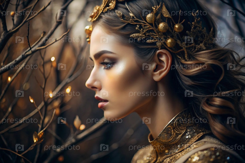 Творческий баннер для салона красоты в черно-золотом цвете. Красивая женщина, окруженная лесом с макияжем и волосами. Золотые ветви дерева в волосах. Индустрия красоты