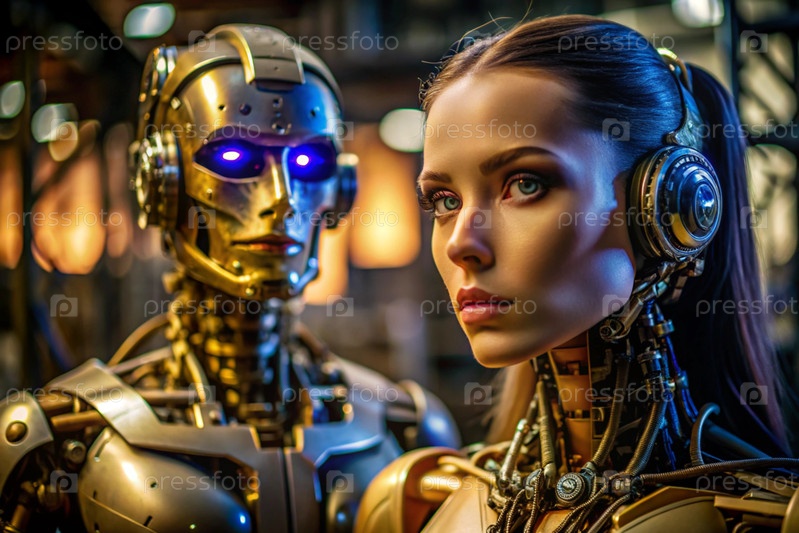 Женский робот-киборг. Интеграция технологий и человеческого взаимодействия. Производство роботов. Искусственный интеллект, Интернет и цифровые технологии будущего