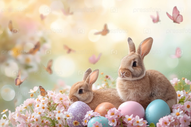 Пасхальные кролики лежат на пасхальных яйцах и смотрят в камеру