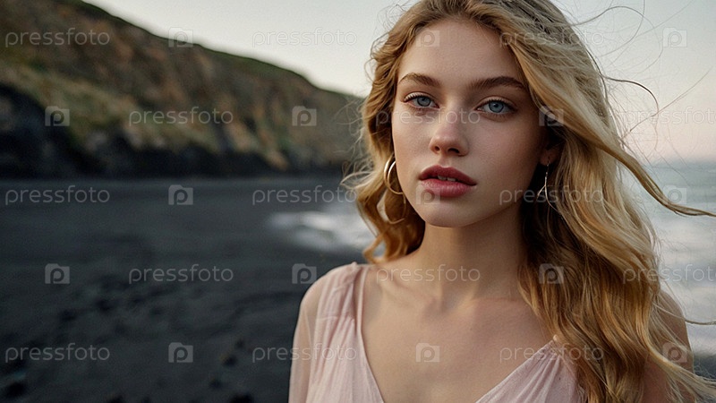 Портрет красивой женщины на пляже перед морем.Романтическая, спокойная и чувственная фотография девушки в проветренном нежном платье