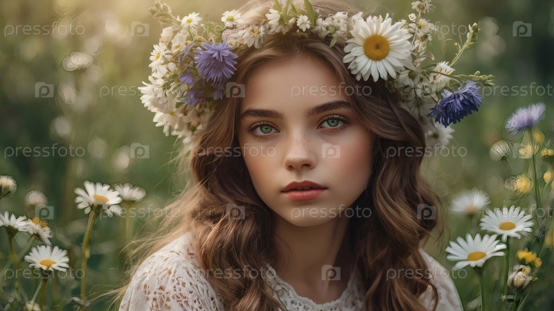 Красивая девушка с венком ромашки и кукурузных цветов на голове в поле. День святого Петра и Февронии. Всероссийский день семьи, любви, верности