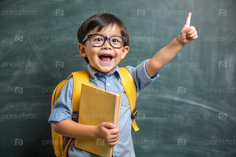 Мальчик с очками показывает класс своей рукой. Ребенок впервые идет в школу. Ребёнок со школьной сумкой и книгой. Ребёнок в классе с доской на заднем плане. Возвращение к школе