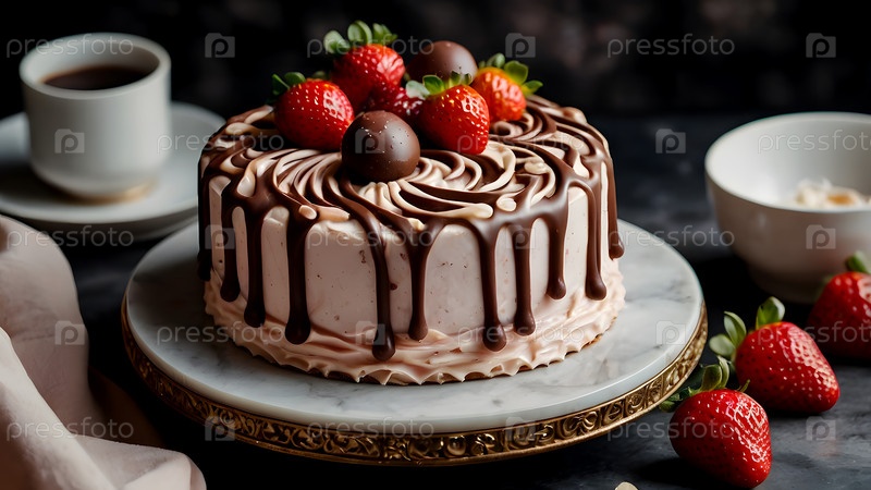 Концепция праздничных блюд. Пекарня. Красивый вкусный торт со свежими клубниками и шоколадом на столе. День рождения и сладости