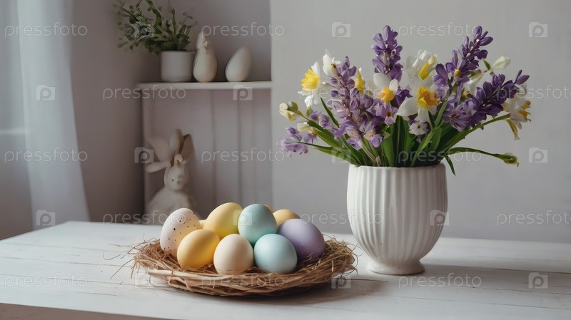 Концепция яркого пасхального праздника. Ретро интерьер дома с пасхальным декором. Весенние цветы в белой вазе и пасхальные яйца в пастельных оттенках