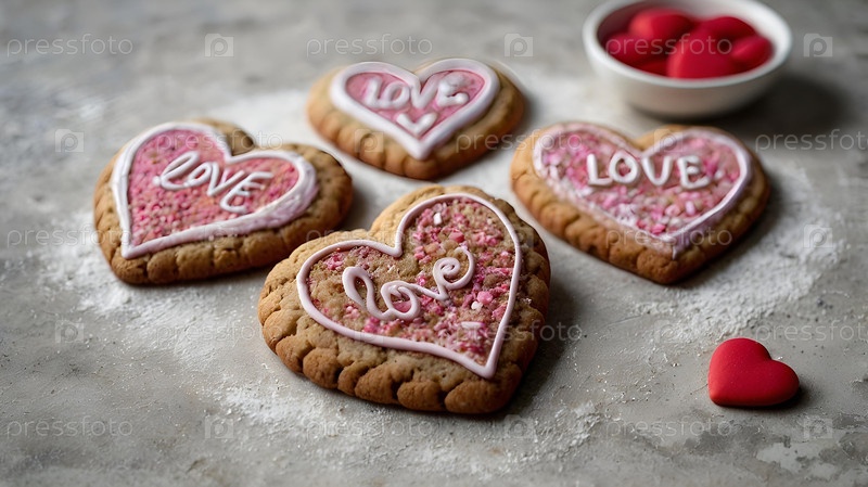 Домашние имбирные печенье в форме сердца с красным сахаром вкусное сердце бисквита из имбиря на сером бетонном фоне свежевыпеченный пряник для дня святого Валентина