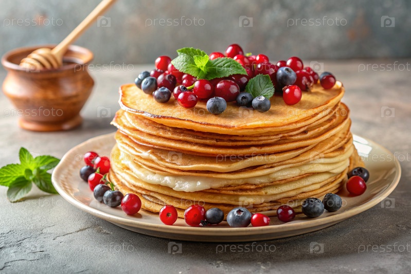 Вкусные блины с медом, ягодами, чернилами, клюквами и малиной.Концепция российского праздника Масленица