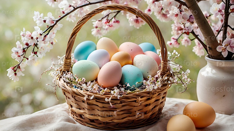 Красивый фон с пасхальными яйцами в плетеновой корзине и весенними вишневыми цветами
