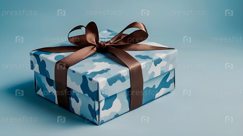 Концепция Дня защитника Отечества 23 февраля.Подарочная камуфляжная коробка с праздничной сатинной лентой луков на светло-синем фоне