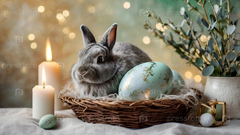 Нежные пасхальные яйца, серый кролик и зеленые ветви эвкалипта на пастельном акварельном фоне с нежными венками