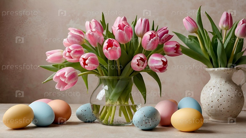 Букет тюльпанов и нежные пасхальные яйца на столе, красивая Пасхальная открытка. концепция минимализма