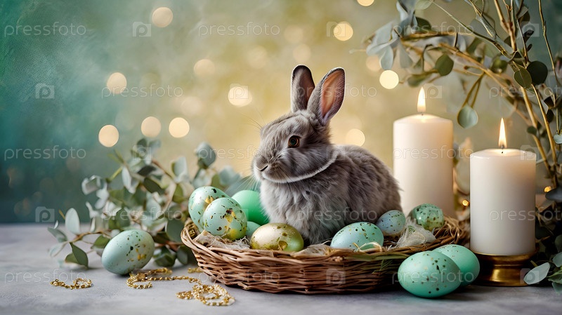 Нежные пасхальные яйца, серый кролик и зеленые ветви эвкалипта на пастельном акварельном фоне с нежными венками