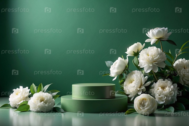 Минимальный изумрудно-пастельный фон для демонстрации продукта.Современный подиум с зеленой стеной и белыми пионками вокруг.Креативный дизайн для презентации продукции