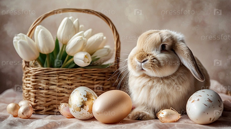 Нежные пасхальные жемчужинные яйца в корзине, кролик и нежные цветы на пастельном аквареле