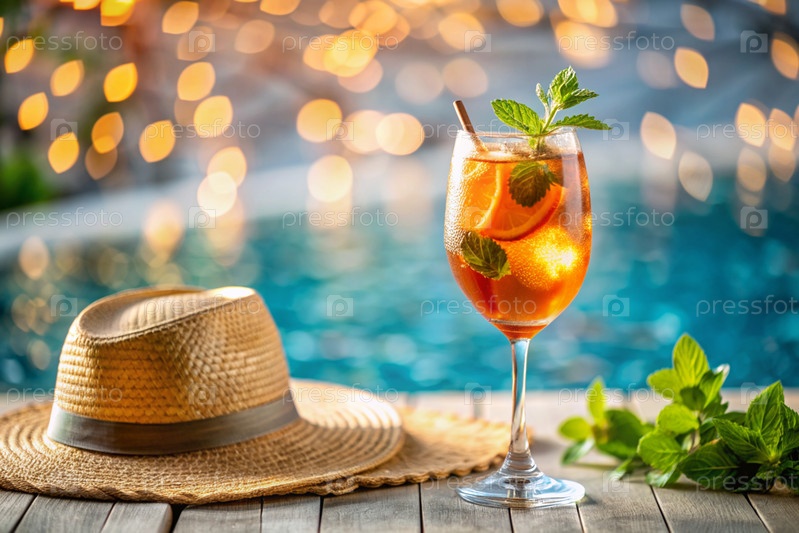 Стакан вкусного апельсинового коктейля Aperol на фоне бассейна.Алкогольный коктейль сочных фруктов с апельсином, кубиками льда и мятой
