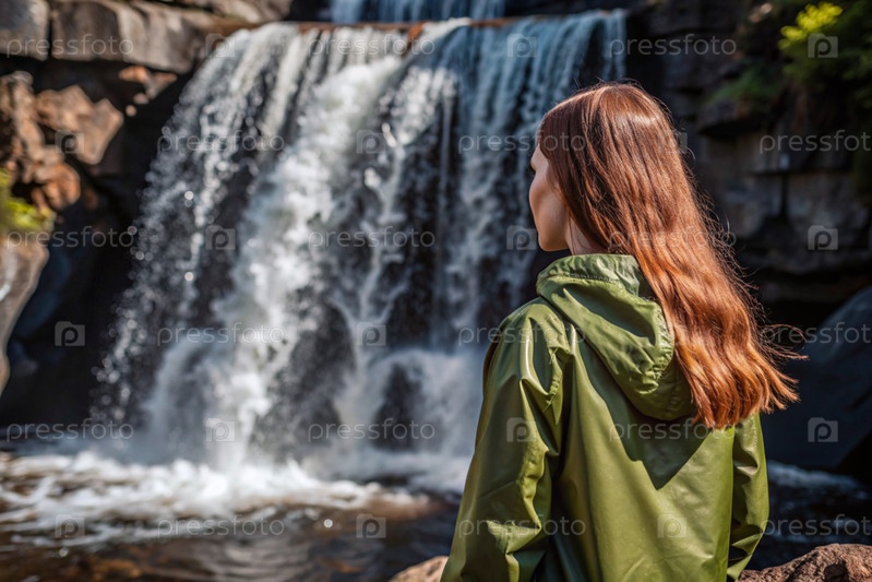 Женщина в резиновом плаще среди огромного голубого водопада. она путешествует и наслаждается жизнью и окружающей средой. туризм
