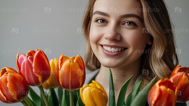 Баннер.Девушка держит красивый букет тюльпанов.Поздравительная открытка на 8 марта и Международный женский день.Концепция поздравлений и празднований