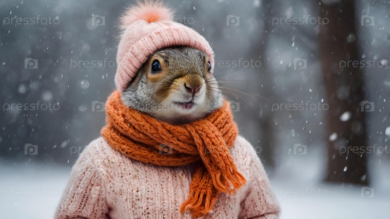 белка с большими щеками, одетая в уютную мягкую розовую тёплую одежду, шляпу и шарф на зимнюю тематику
