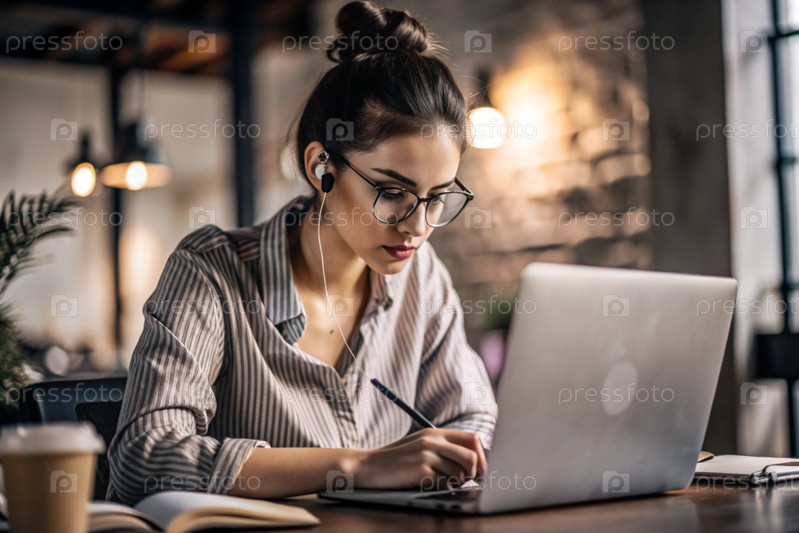 Молодая женщина фрилансер в очках и наушниках работает на ноутбуке или делает покупки в интернет-магазине