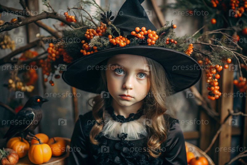 Осенний портрет красивой девушки в костюме ведьмы с осенними ягодами, тыквами и черными птицами. баннер, открытка. концепция Хэллоуина