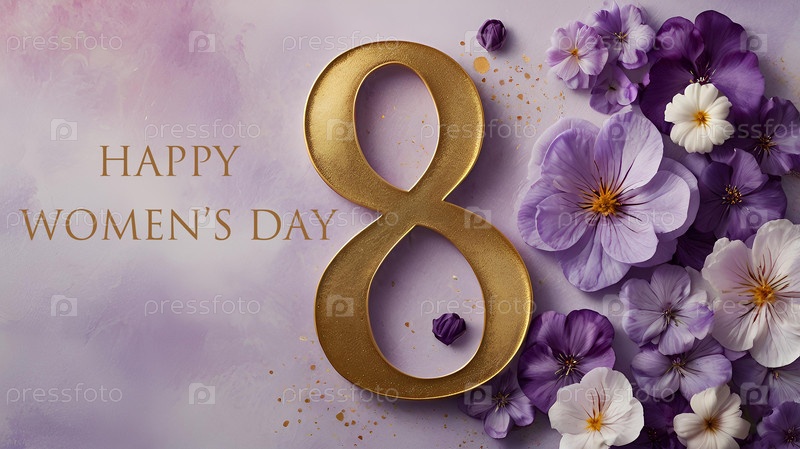 Международный женский день. праздник приходится на 8 марта. баннер, флаер. торжественный, нежный фиолетовый цветочный фон номер 8