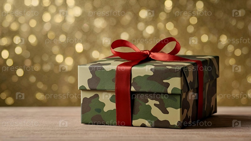 Концепция Дня защитника Отечества 23 февраля.Подарок камуфляжной коробки с праздничной сатинной лентой лука на золотом фоне