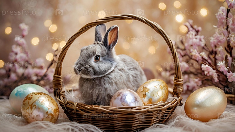 Нежные пасхальные жемчужинные яйца в корзине, кролик и нежные цветы на пастельном аквареле