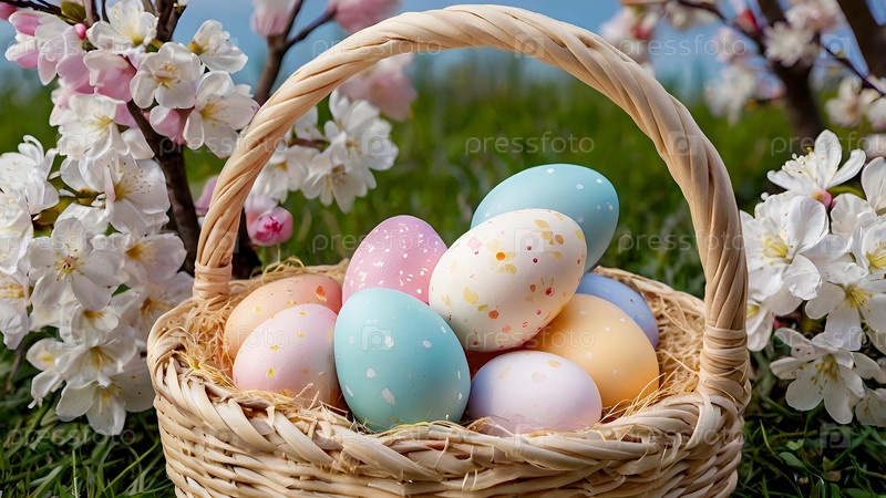 Красивый фон с пасхальными яйцами в плетеновой корзине и весенними вишневыми цветами