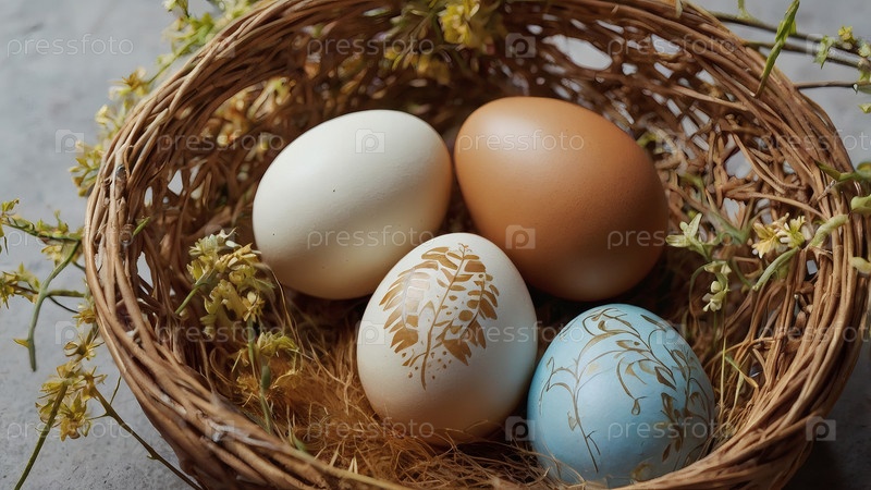 Концепция яркого пасхального праздника.Нежные деревенские пасхальные яйца в плетеновой корзине